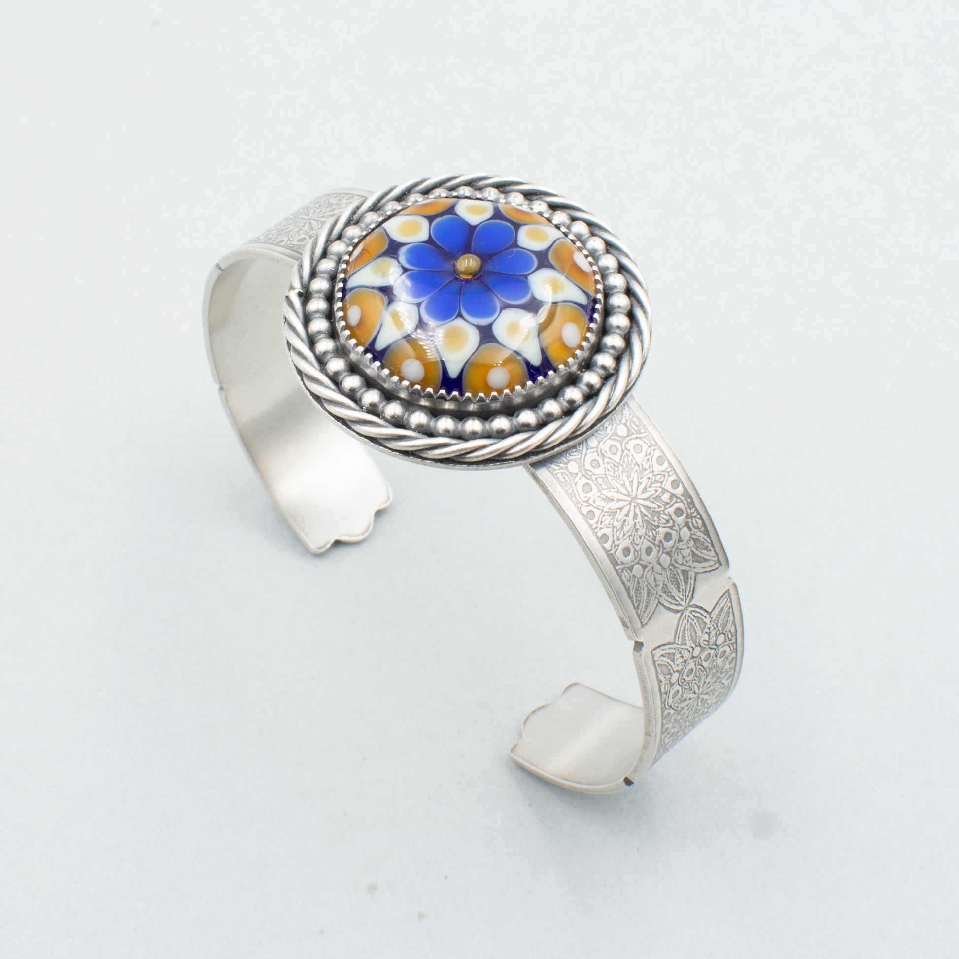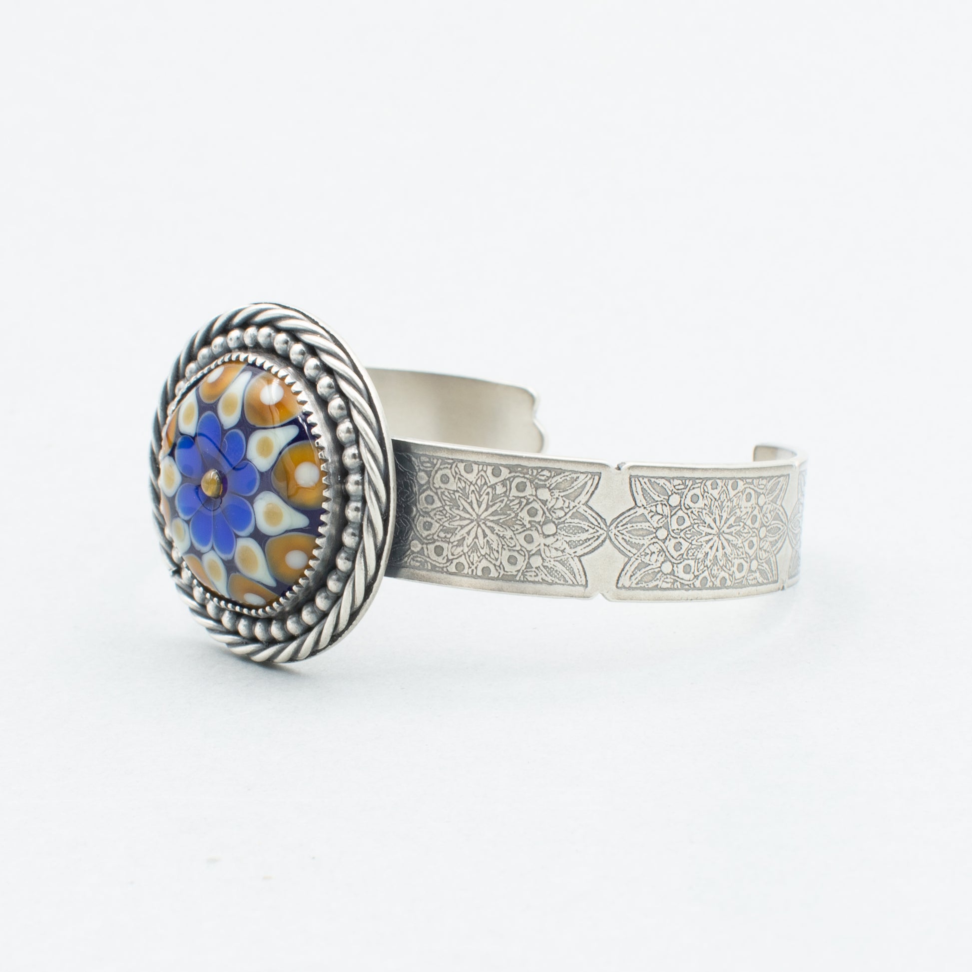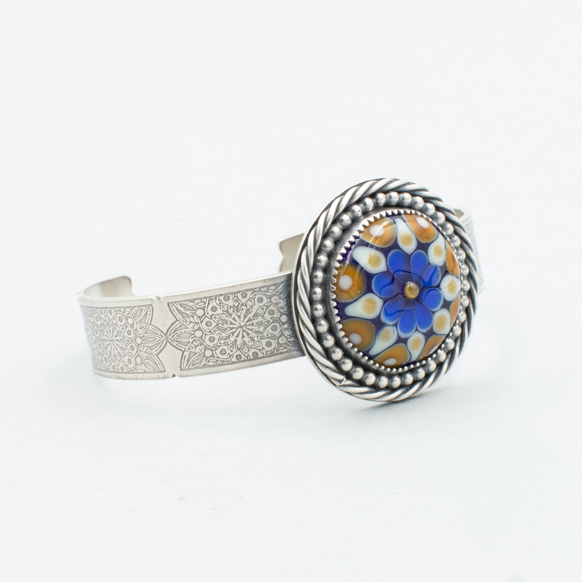 Each piece of my wearable art is hand-fabricated including my one-of-a-kind lampwork glass cabochons. My original designs, are influenced by symbolic mandala patterns which are etched or milled into sterling silver. As the piece comes together I add additional fine or sterling silver elements for balance, texture, and interest.