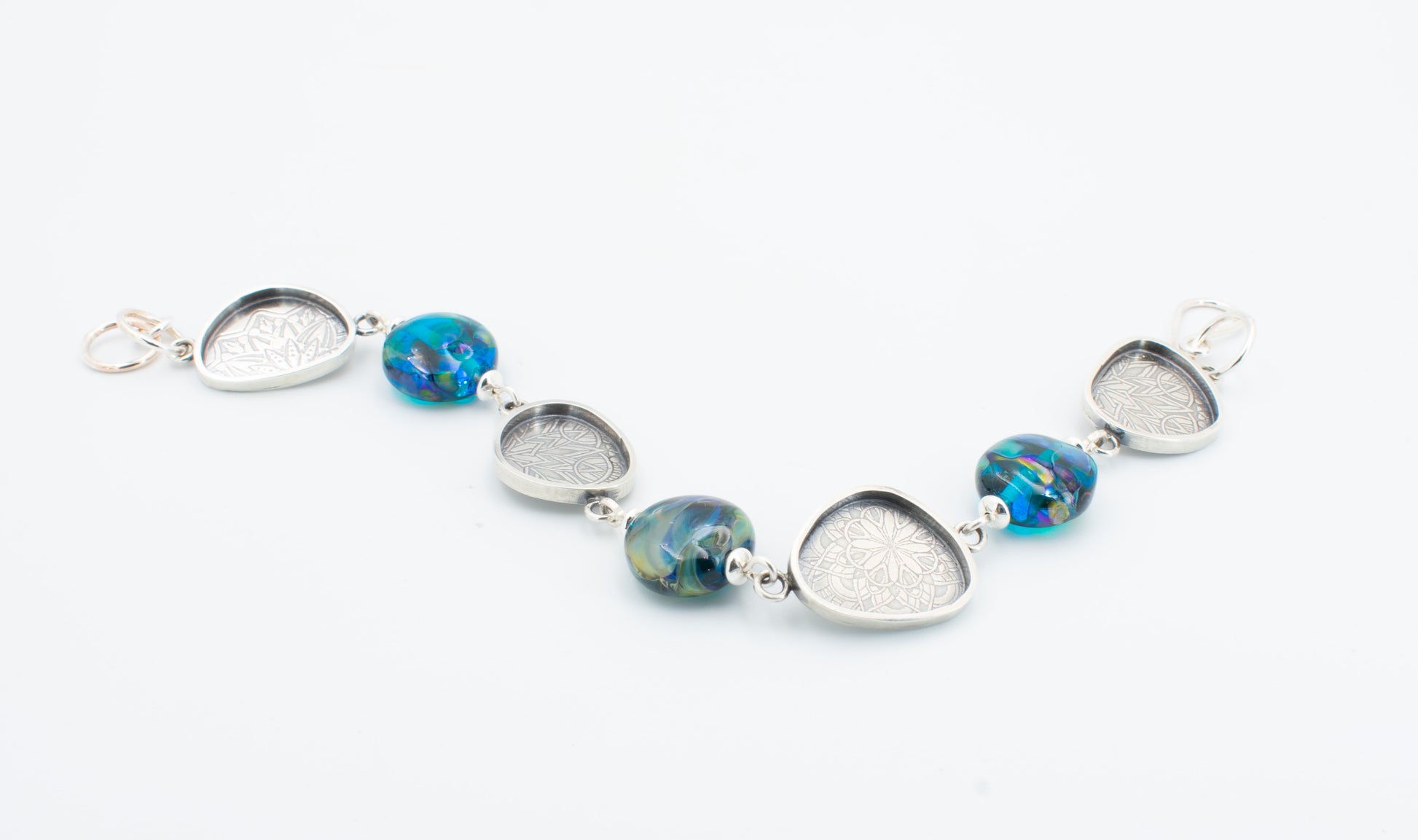 Each piece of my wearable art is hand-fabricated including my one-of-a-kind lampwork glass cabochons. My original designs, are influenced by symbolic mandala patterns which are etched or milled into sterling silver. As the piece comes together I add additional fine or sterling silver elements for balance, texture, and interest.