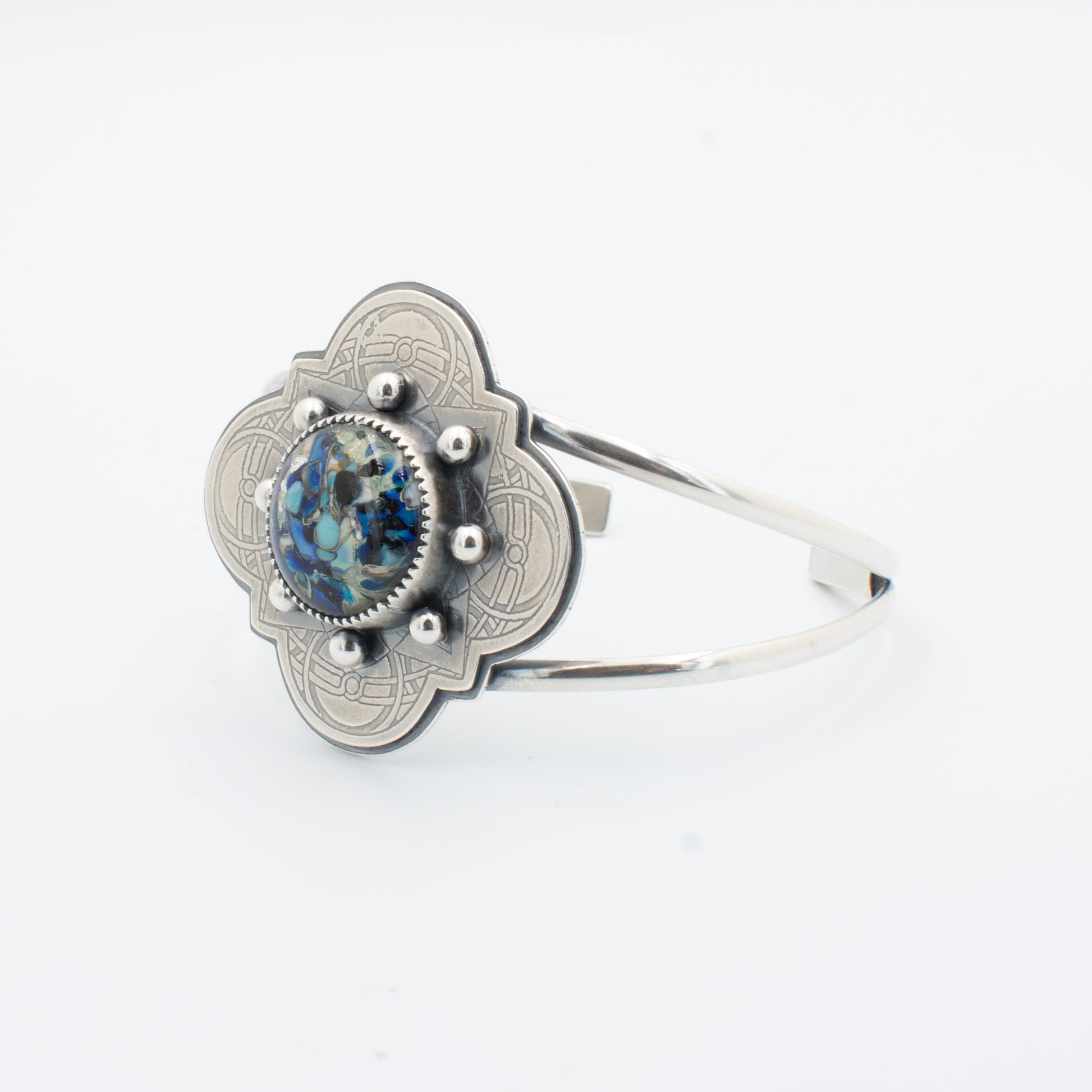 Each piece of my wearable art is hand-fabricated including my one-of-a-kind lampwork glass cabochons. My original designs, are influenced by symbolic mandala patterns which are etched or milled into sterling silver. As the piece comes together I add additional fine or sterling silver elements for balance, texture, and interest.