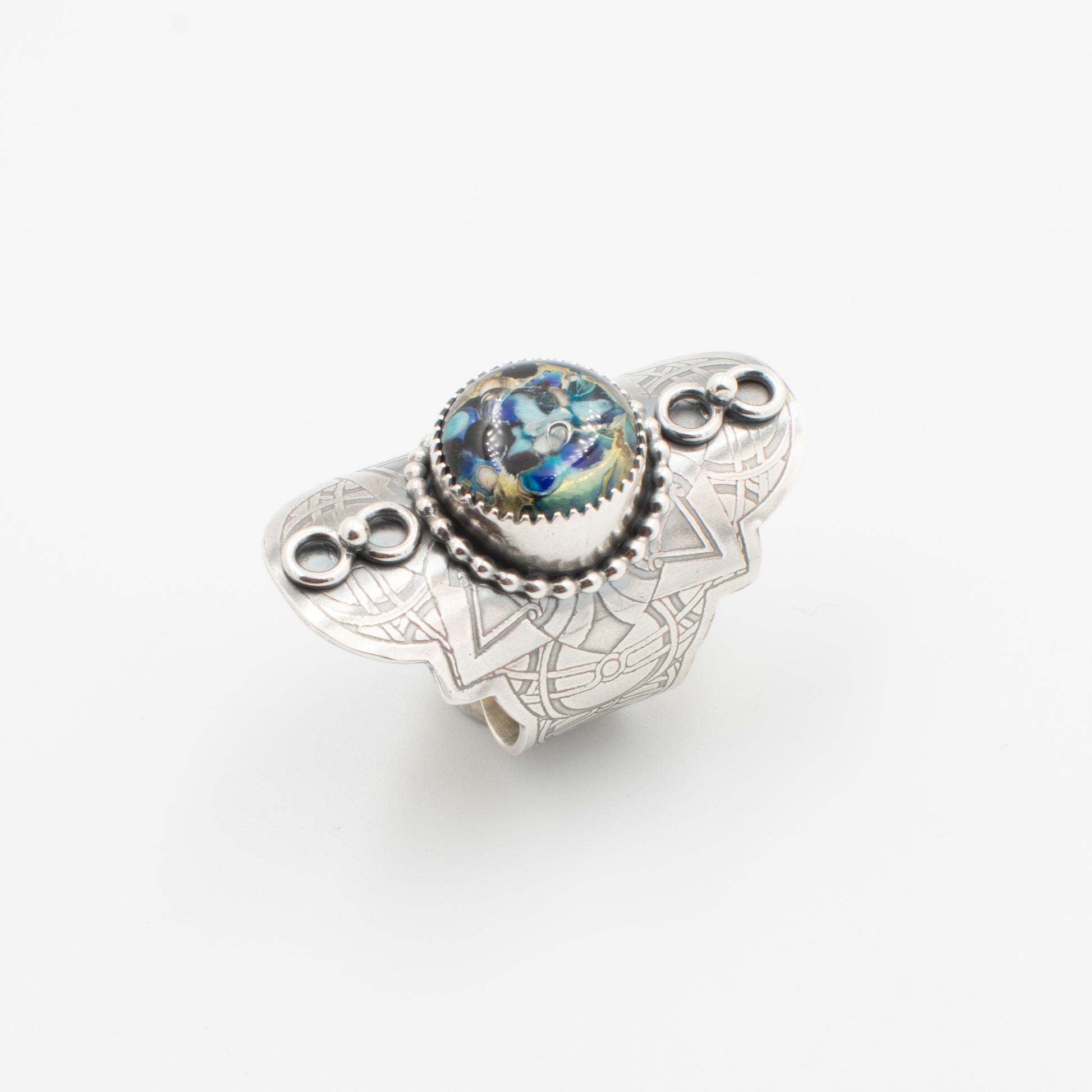 Each piece of my wearable art is hand-fabricated including my one-of-a-kind lampwork glass cabochons. My original designs, are influenced by symbolic mandala patterns which are etched or milled into sterling silver. As the piece comes together I add additional fine or sterling silver elements for balance, texture, and interest.