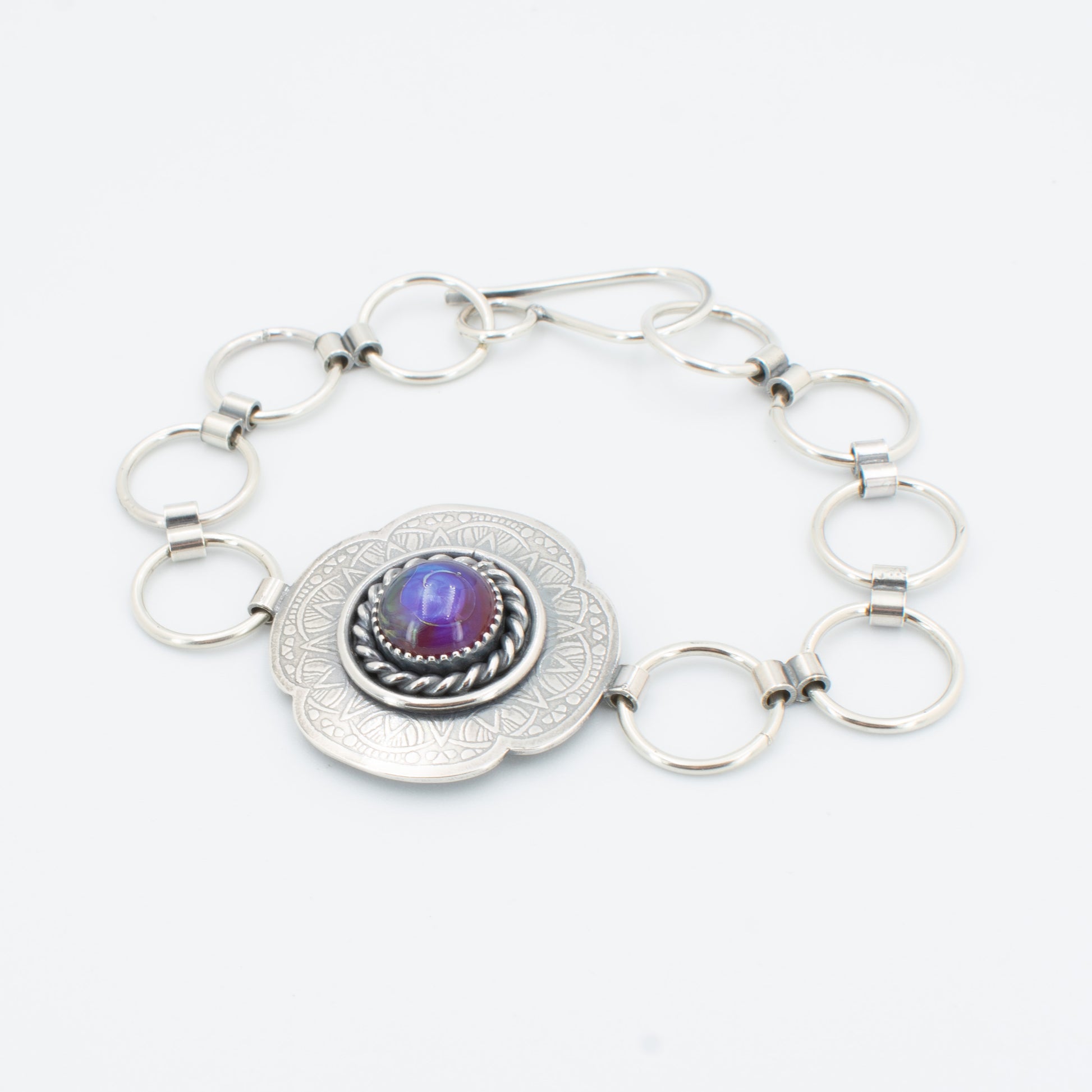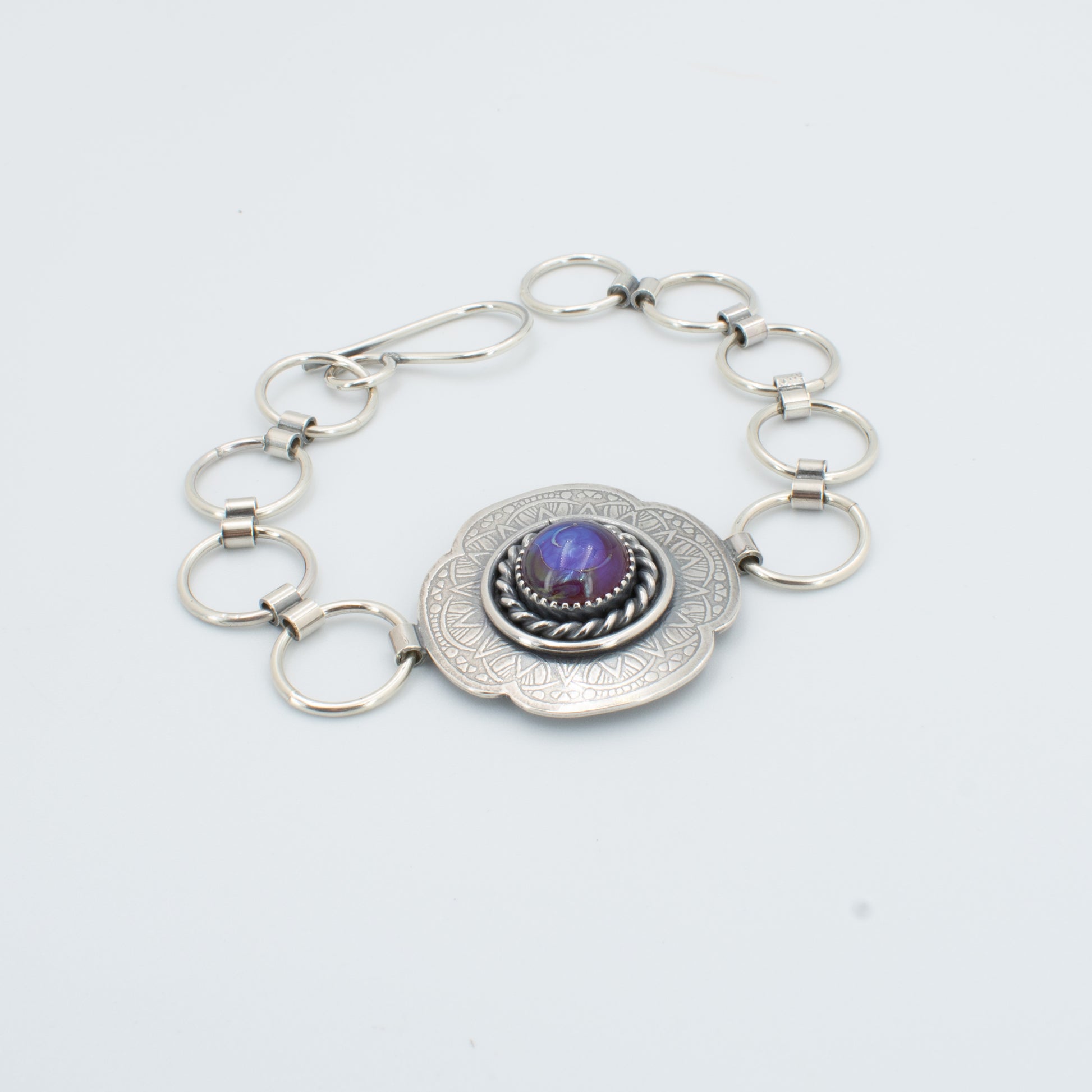 Each piece of my wearable art is hand-fabricated including my one-of-a-kind lampwork glass cabochons. My original designs, are influenced by symbolic mandala patterns which are etched or milled into sterling silver. As the piece comes together I add additional fine or sterling silver elements for balance, texture, and interest.