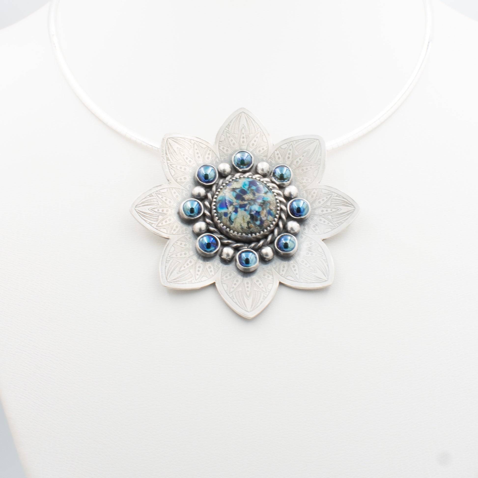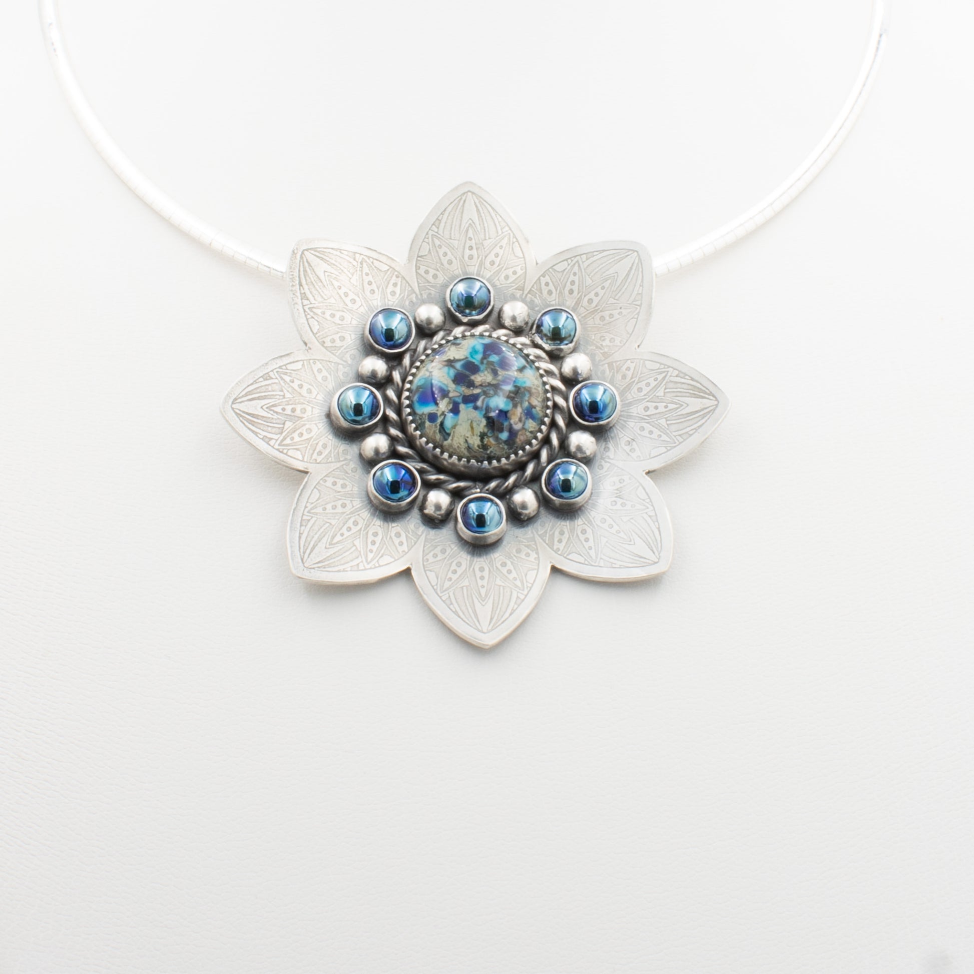 Each piece of my wearable art is hand-fabricated including my one-of-a-kind lampwork glass cabochons. My original designs, are influenced by symbolic mandala patterns which are etched or milled into sterling silver. As the piece comes together I add additional fine or sterling silver elements for balance, texture, and interest.