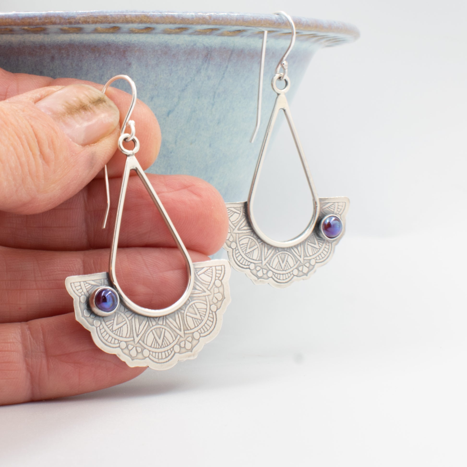 Each piece of my wearable art is hand-fabricated including my one-of-a-kind lampwork glass cabochons. My original designs, are influenced by symbolic mandala patterns which are etched or milled into sterling silver. As the piece comes together I add additional fine or sterling silver elements for balance, texture, and interest.