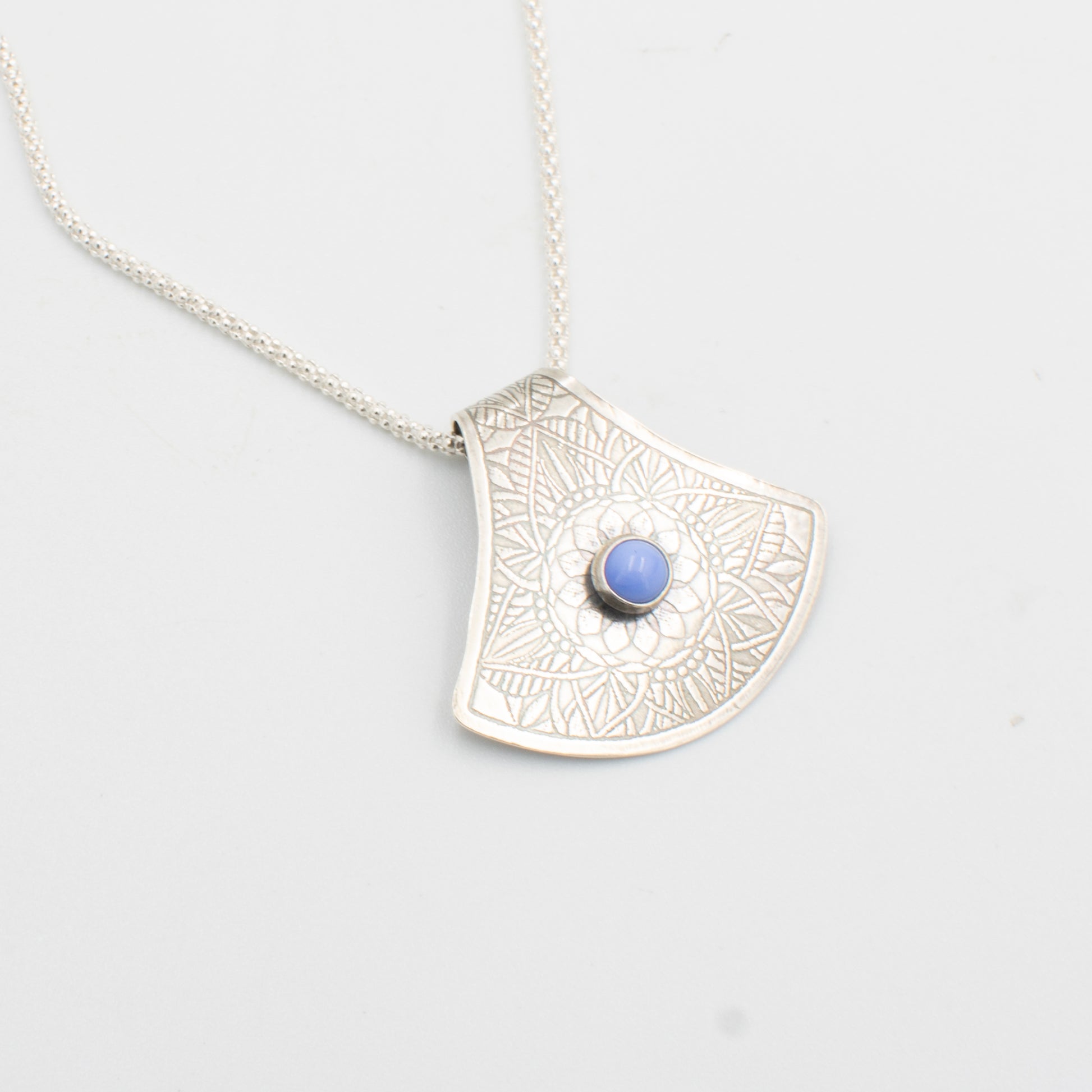 Each piece of my wearable art is hand-fabricated including my one-of-a-kind lampwork glass cabochons. My original designs, are influenced by symbolic mandala patterns which are etched or milled into sterling silver. As the piece comes together I add additional fine or sterling silver elements for balance, texture, and interest.