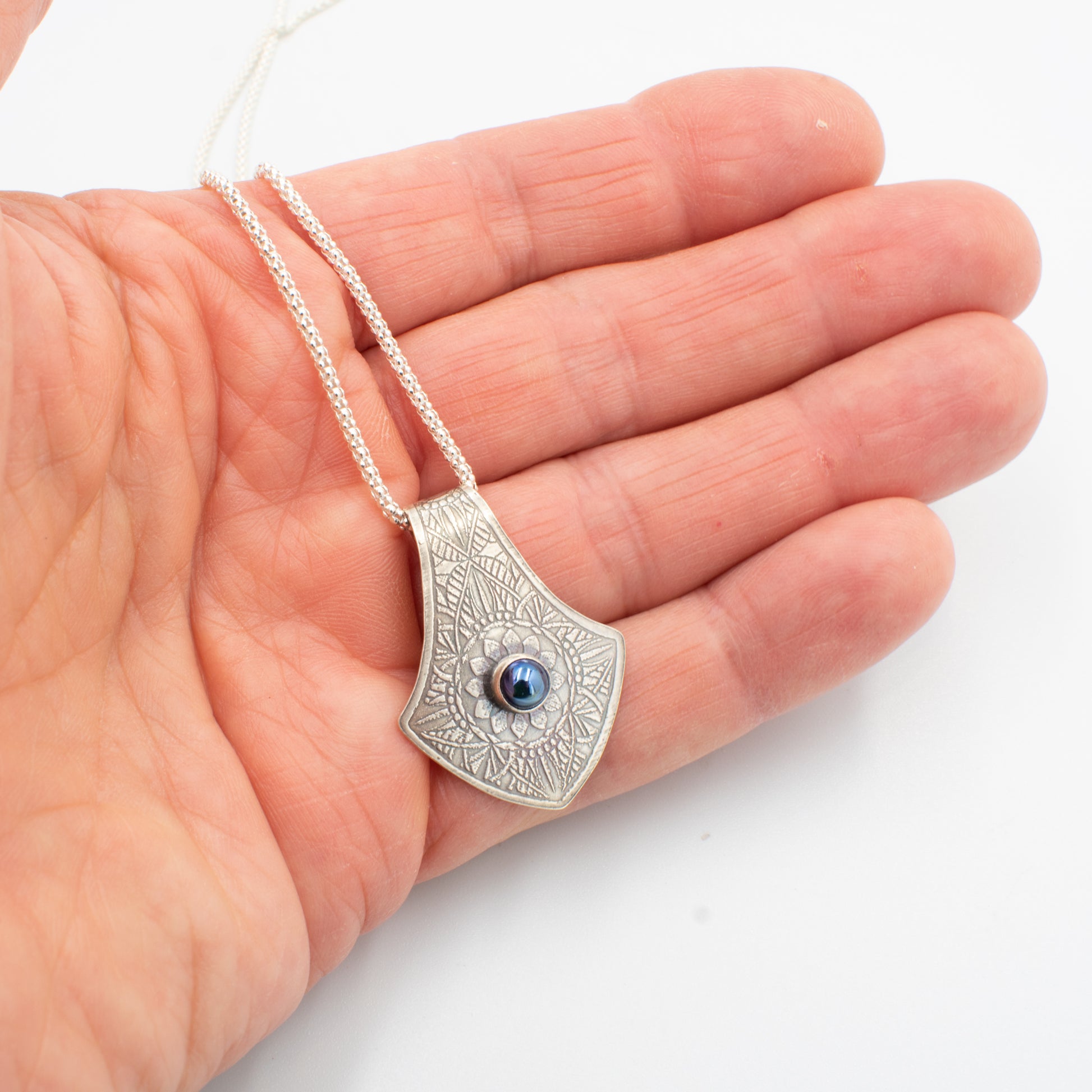 Each piece of my wearable art is hand-fabricated including my one-of-a-kind lampwork glass cabochons. My original designs, are influenced by symbolic mandala patterns which are etched or milled into sterling silver. As the piece comes together I add additional fine or sterling silver elements for balance, texture, and interest.