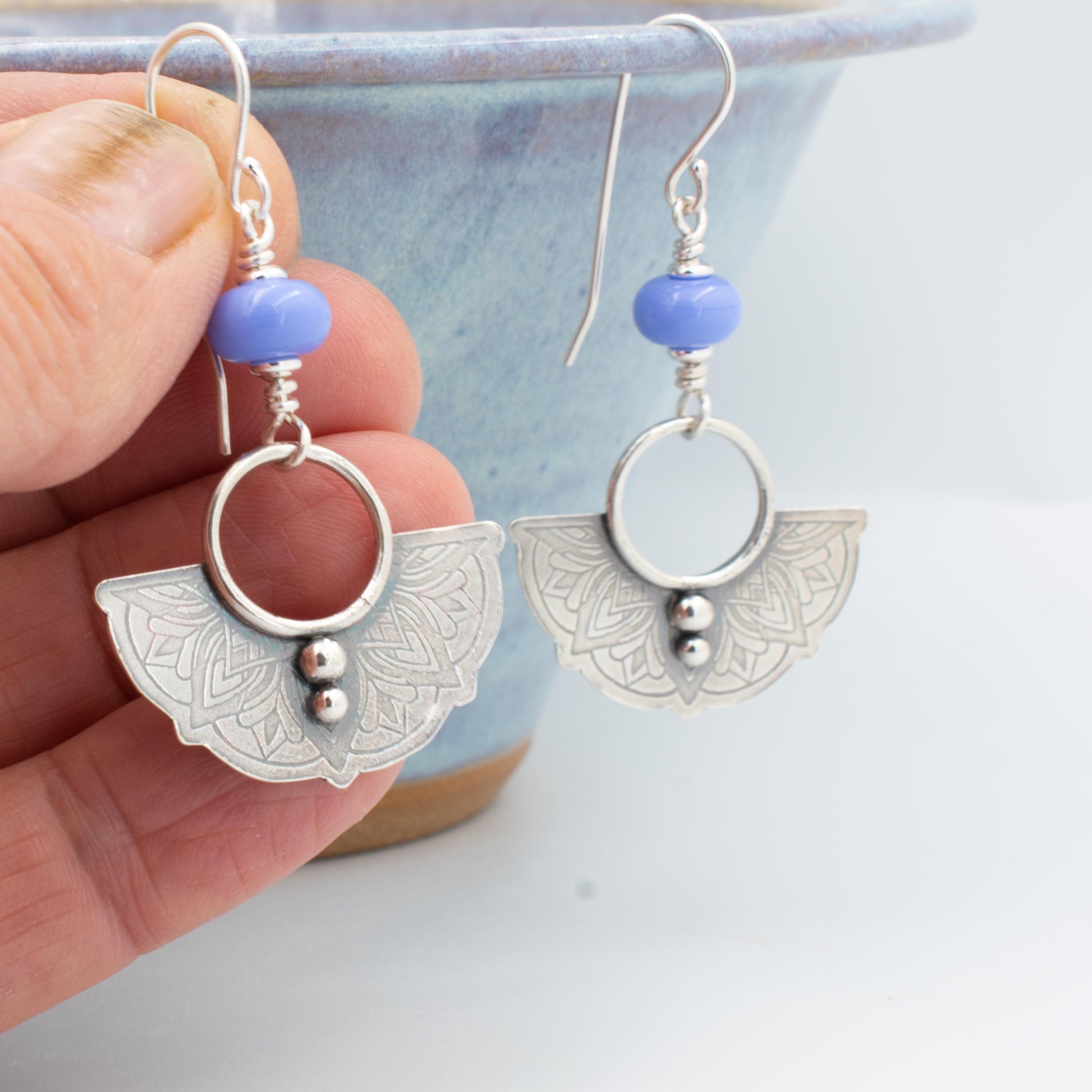 Each piece of my wearable art is hand-fabricated including my one-of-a-kind lampwork glass cabochons. My original designs, are influenced by symbolic mandala patterns which are etched or milled into sterling silver. As the piece comes together I add additional fine or sterling silver elements for balance, texture, and interest.