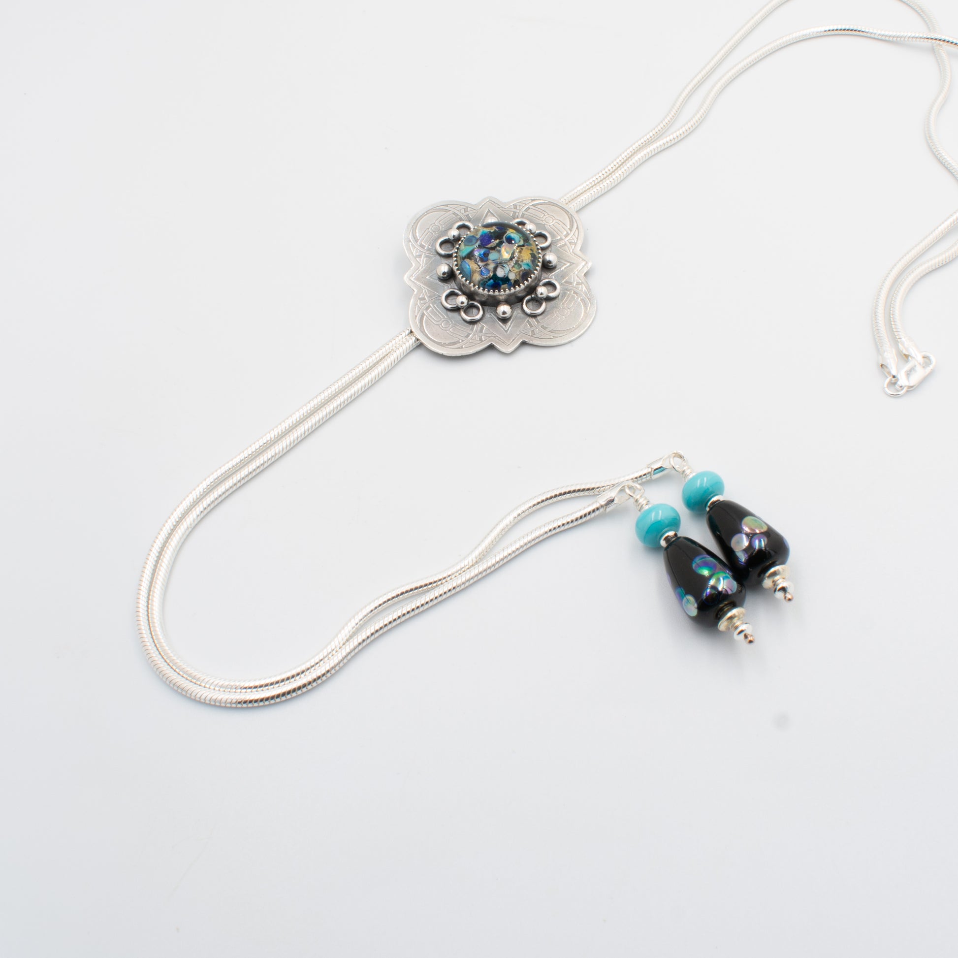 Each piece of my wearable art is hand-fabricated including my one-of-a-kind lampwork glass cabochons. My original designs, are influenced by symbolic mandala patterns which are etched or milled into sterling silver. As the piece comes together I add additional fine or sterling silver elements for balance, texture, and interest.